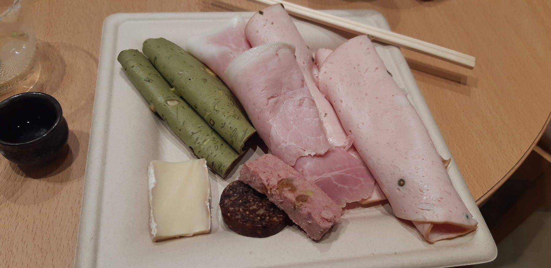 ハム類が配られたのだが。豚のレバー。ドライフルーツ(チーズの横)、チーズの名前が分からないw